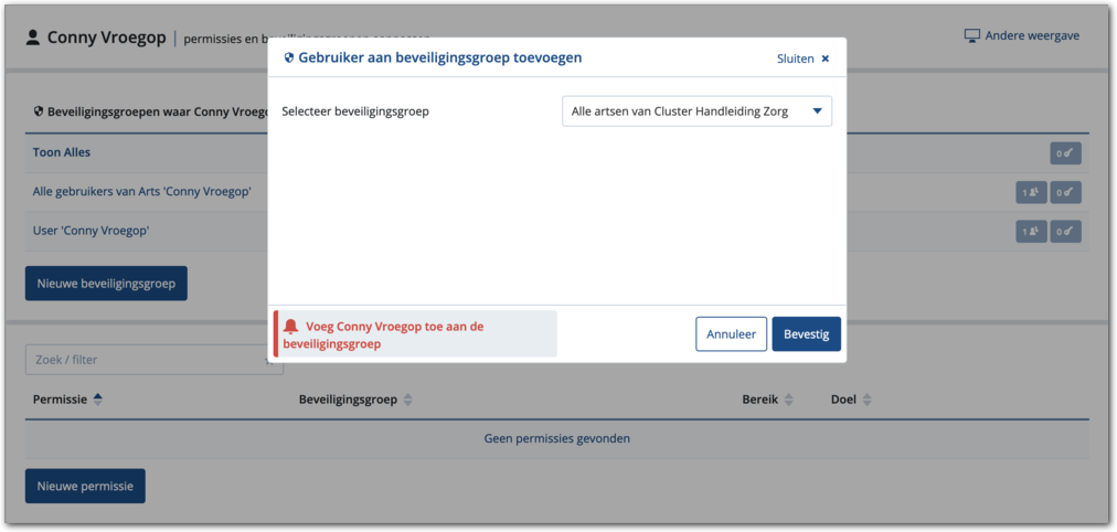 Hierna vraagt Medimo het toevoegen van de gebruiker aan de beveiligingsgroep te bevestigen. De onderstaande afbeelding is daarvan een voorbeeld.