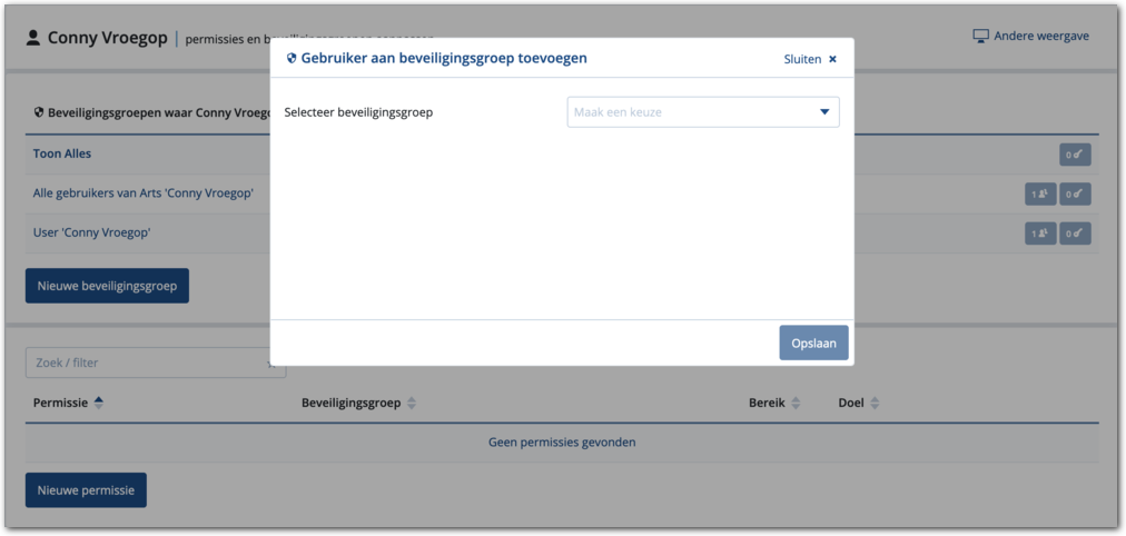 Hierdoor opent Medimo een modal en vraagt een beveiligingsgroep te selecteren. De onderstaande afbeelding is daarvan een voorbeeld.