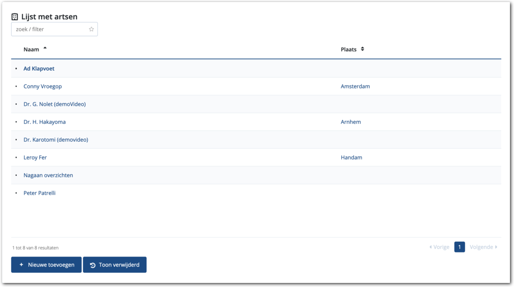 Het aanmaken van een arts entiteit kan vanuit de lijst met arts entiteiten. Gebruik het zoeken in alles veld of klik vanuit het dashboard op Onderhoud > Entiteiten > Artsen beheren. De onderstaande afbeelding is een voorbeeld van een lijst met arts entiteiten.
