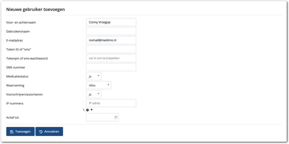 Medimo toont een formulier om een gebruiker aan te maken onderstaande afbeelding is daarvan een voorbeeld.