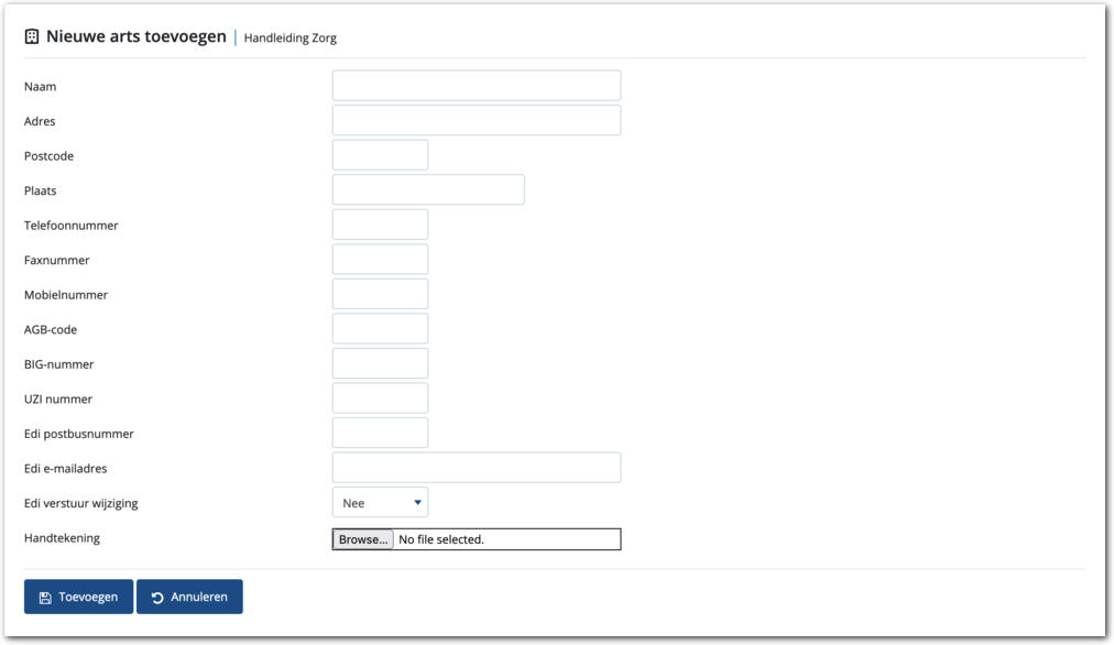 Medimo toont een formulier om een nieuwe arts entiteit aan te maken. De onderstaande afbeelding is daarvan een voorbeeld.