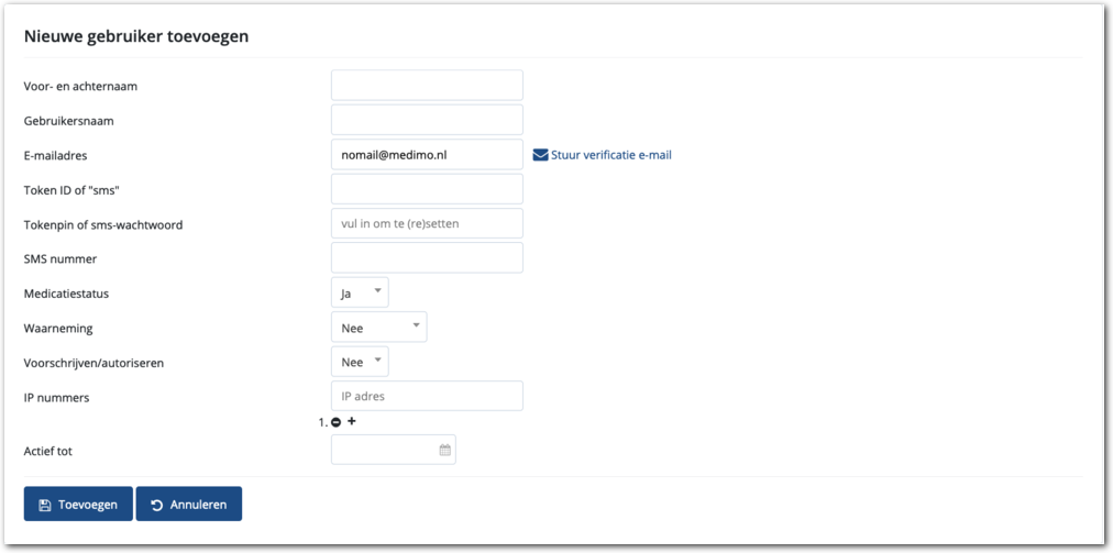 Hierna toont Medimo een formulier waarmee u een gebruiker kunt toevoegen. De onderstaande afbeelding is daarvan een voorbeeld.