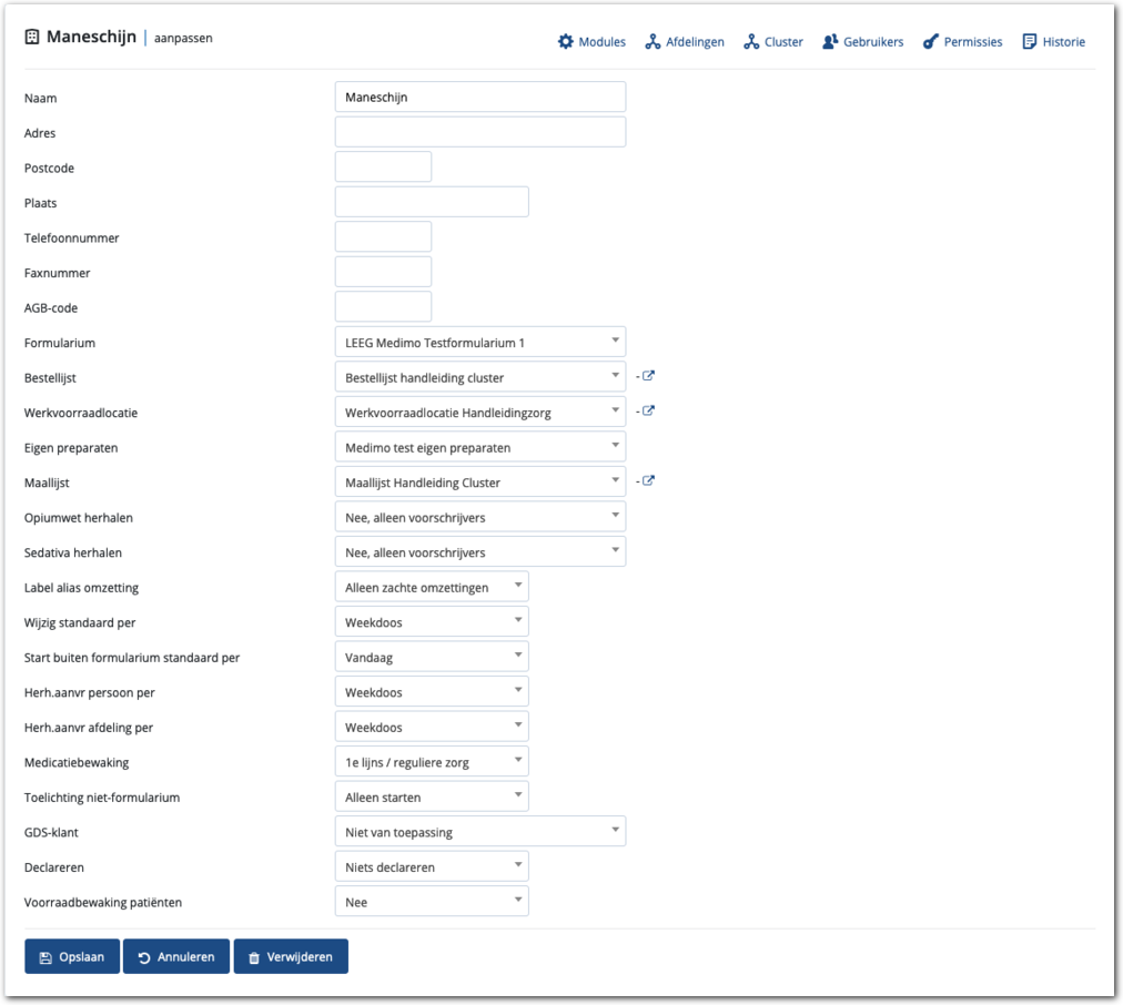 vanuit het hoofdmenu op Onderhoud > Entiteiten > Locaties beheren. Daar toont Medimo lijst van locatie entiteiten. Klik op de locatie waaronder de gebruiker wilt toevoegen. De onderstaande afbeelding is een voorbeeld van een locatie entiteit.