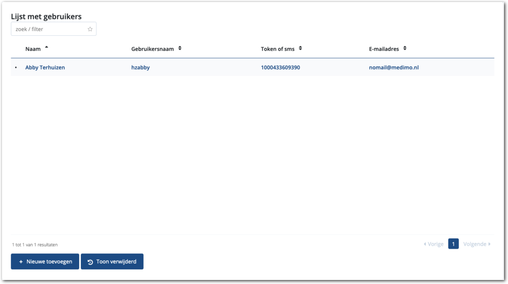Hiermee maakt u het account aan en toont Medimo de lijst met gebruikers.