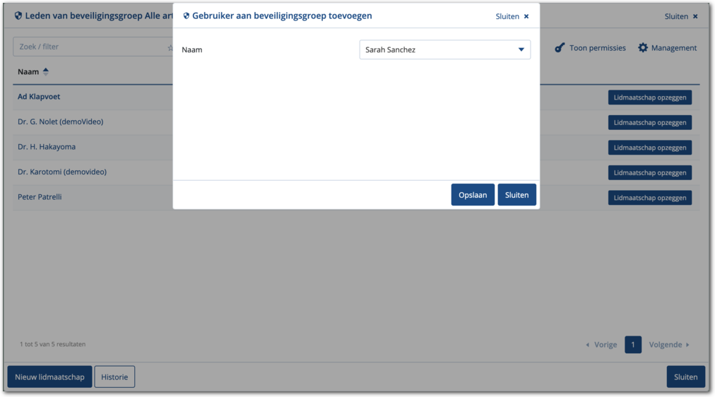 Medimo opent een modal om een gebruiker toe te voegen aan de beveiligingsgroep. De onderstaande afbeelding is daarvan een voorbeeld.