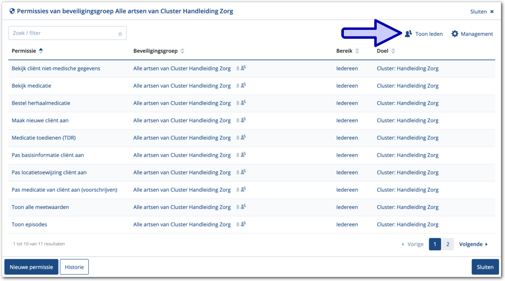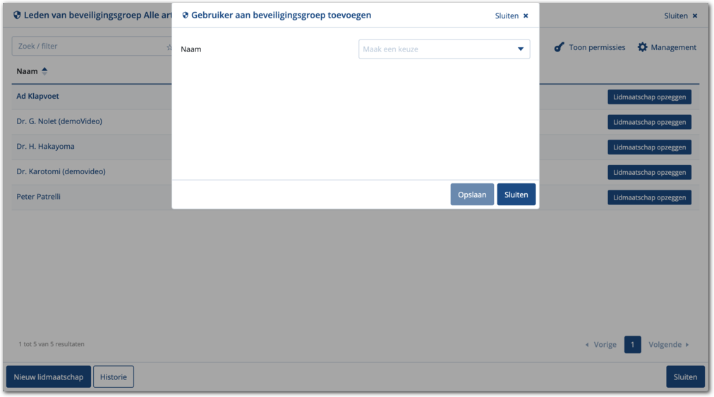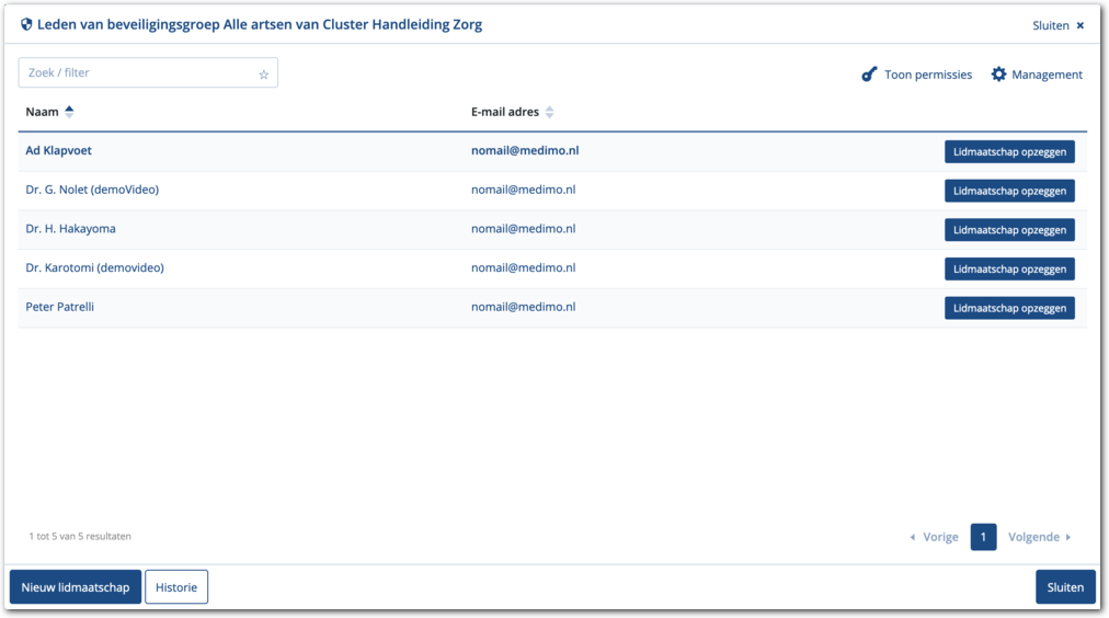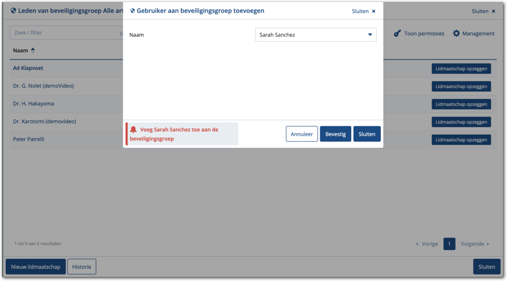 Hiermee maakt ude gebruiker lid van de beveiligingsgroep en toont Medimo de lijst met leden. Het lid maken van de gebruiker heeft direct effect waardoor die direct aan de slag kan.