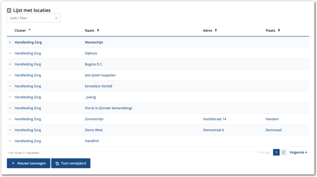 Dit kan vanuit de lijst met locatie entiteiten. Gebruik het 'Zoeken in alles'-veld of klik vanuit het hoofdmenu op Onderhoud > Entiteiten > Locaties beheren. Onderstaande afbeelding is een voorbeeld van een lijst met locatie entiteiten.