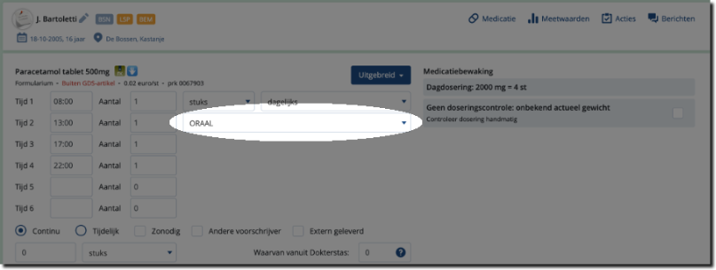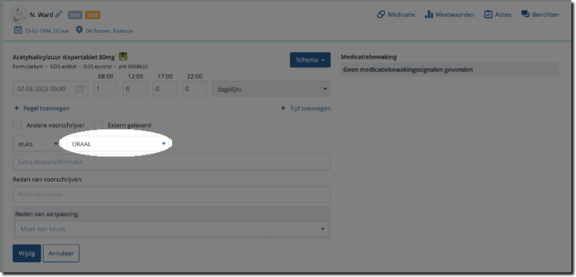 Ja. Gebruikers die de permissies 'Pas medicatie van cliënt aan' voor de cliënt hebben (dit zijn doorgaans artsen), kunnen de toedienweg opgeven. Deze toedienweg bepaalt welke wijze van toedieningen wordt getoond op de toedienlijst of ...