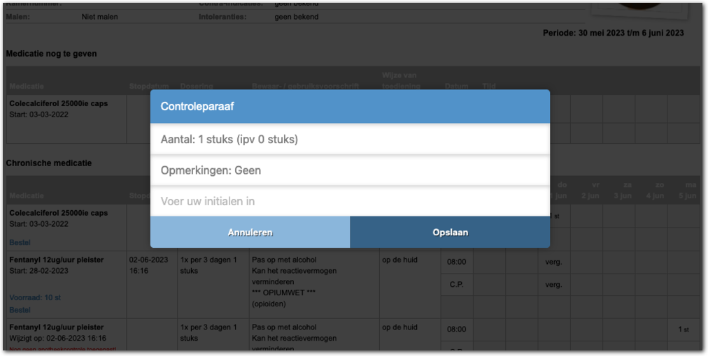 Hiermee registreert u de controle en toont Medimo de initialen van de controleur in het vakje onder 'wacht'.