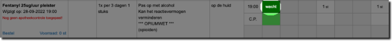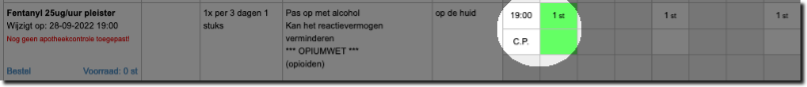 Dit artikel beschrijft hoe u een toediening met een controleparaaf registreert in de Medimo webversie. Medicatie waarvan de toediening een extra controle behoeft herkent u aan de afkorting C.P. (controleparaaf). De onderstaande afbeelding is daarvan een voorbeeld.
