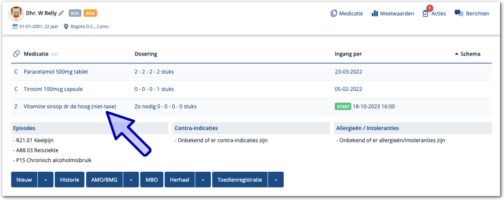 Het is in Medimo mogelijk om een 'niet in taxe' artikel voor te schrijven. De onderstaande afbeelding is een voorbeeld daarvan. De blauwe pijl wijst naar het betreffende artikel.