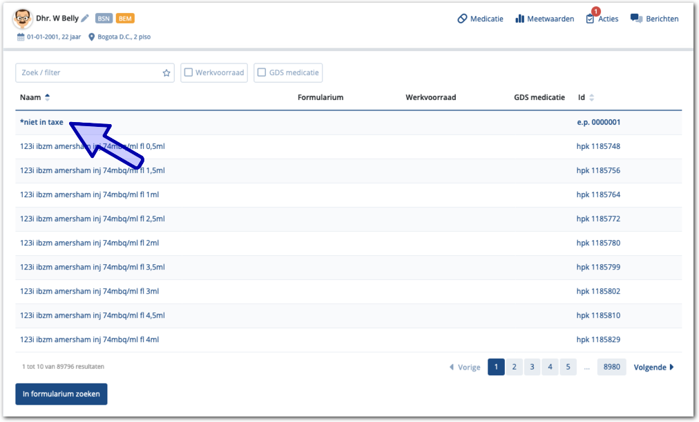 Let op! Wanneer u een 'niet in taxe' regel voorschrijft kan daar geen medicatiebewaking op worden uitgevoerd!