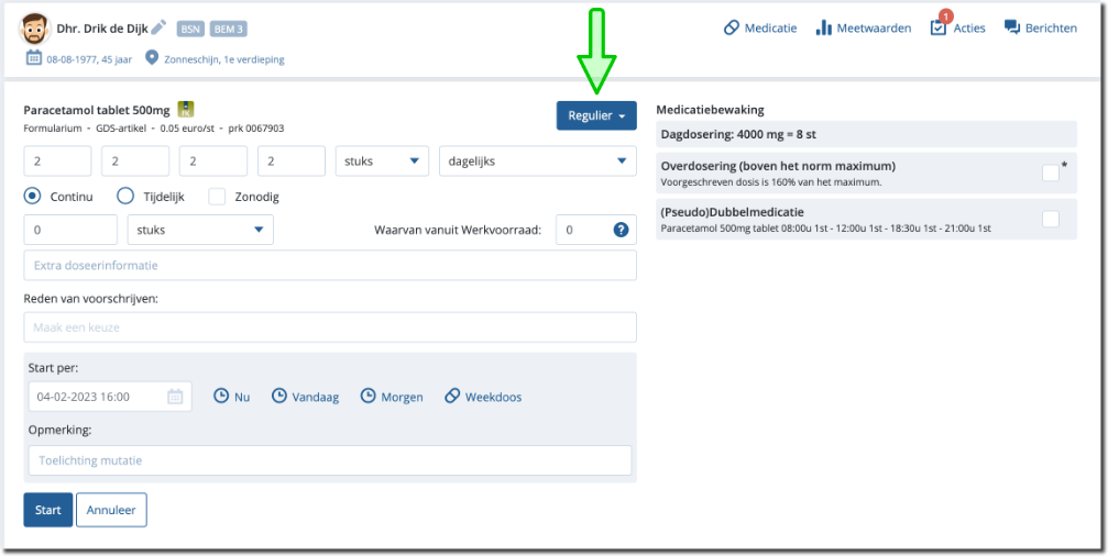 Standaard neemt Medimo de dosering gedefinieerd in het formularium over. Deze dosering is door u aan te passen. Ook is de weergave om de dosering op te geven aan te passen met de blauwe knop (zie groene pijl in bovenstaande afbeelding). Er zijn 4 weergaves waaruit u kunt kiezen. - Regulier - Met de weergave Regulier kunt voor de standaardeeltijden continue, tijdelijk en zonodig medicatie invoeren. Zie ook het artikel Hoe werkt bij het voorschrijven de weergave Regulier? Meestal maakt u gebruik van deze weergave.