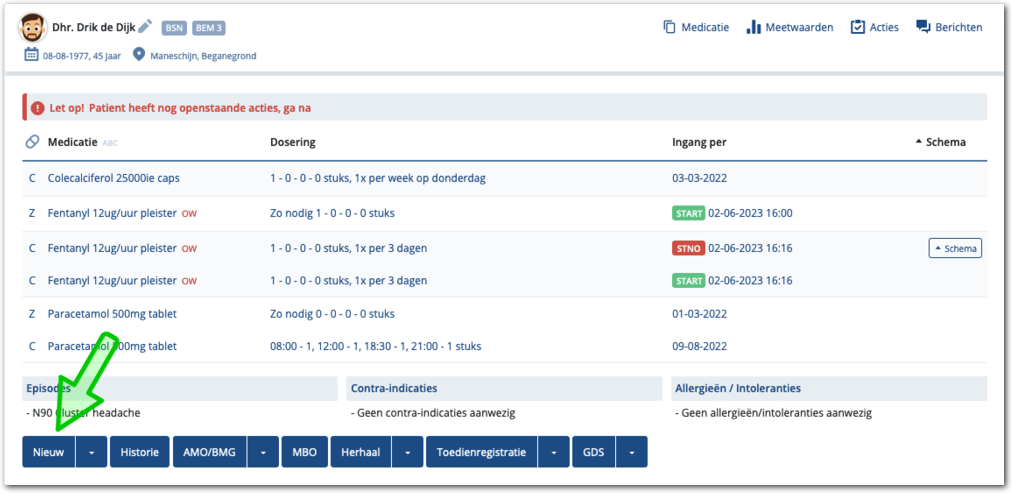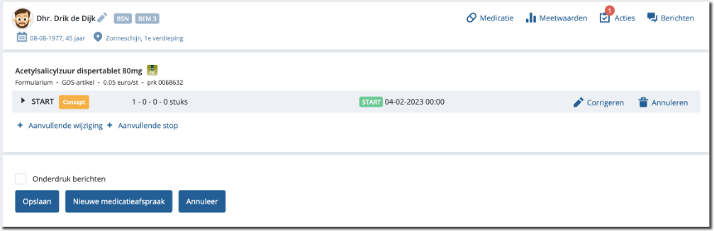 Hier controleert u het voorschrift en kunt snel en eenvoudig wijzigen doorvoeren of een nieuwe medicatie afspraak maken.