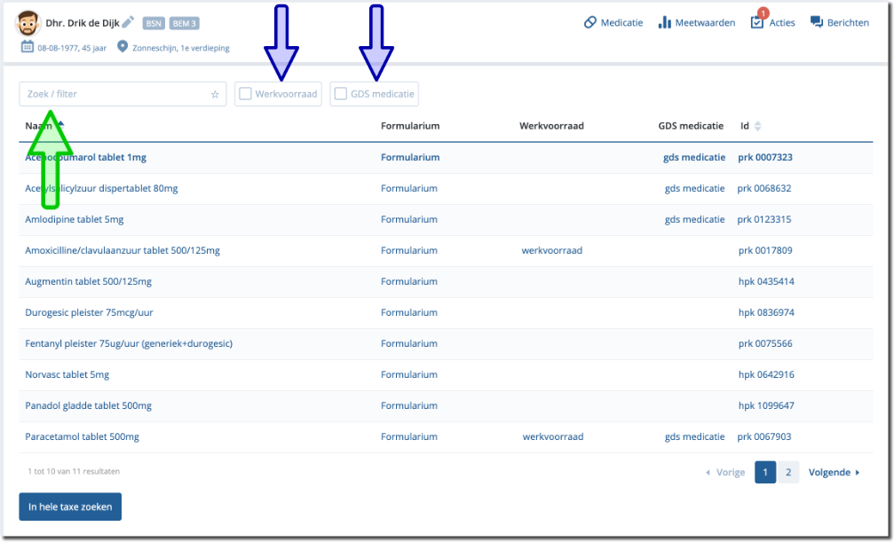 Gebruik hiervoor het 'Zoek / filter'-veld (zie groene pijl bovenstaande afbeelding). U kunt op naam of deel van de naam van het geneesmiddel zoeken, bijvoorbeeld amox 500. Optioneel kunt u de filters Werkvoorraad en GDS medicatie (zie blauwe pijlen bovenstaande afbeelding) gebruiken. Standaard zoekt u in het vigerende formularium. Vindt u het geneesmiddel niet, dan kunt u in de hele taxe zoeken. Klik hiervoor links onderaan op de knop 'In hele taxe zoeken'.