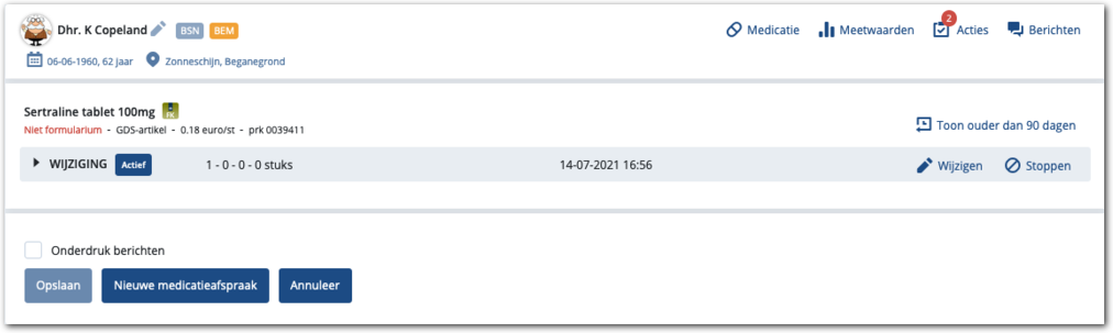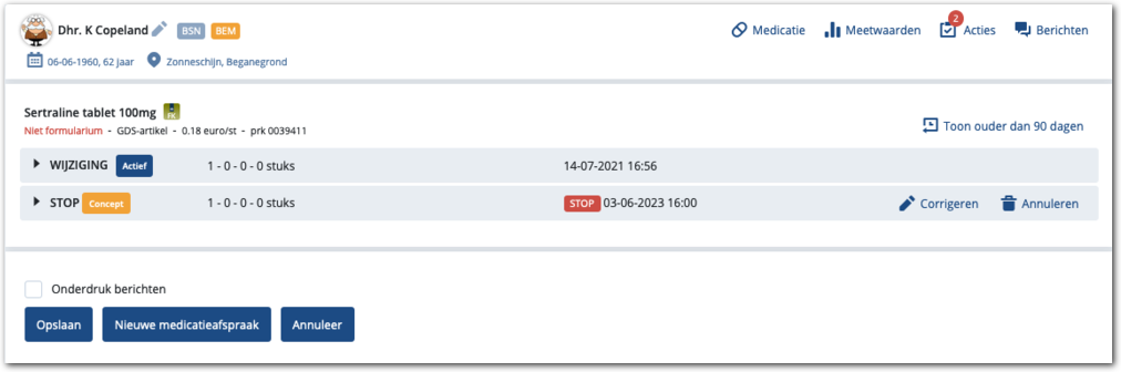 Hier toont Medimo de huidige dosering (te herkennen aan het blauwe label 'Actief') en de stop (te herkennen aan het gele label 'Concept').