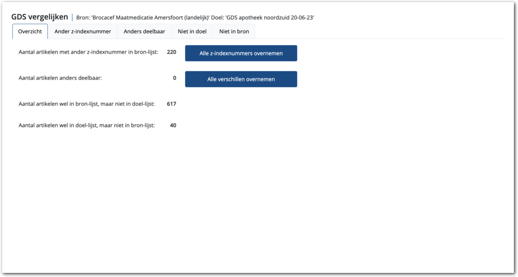 Hier toont Medimo wat de verschillen zijn. Deze kunt u nagaan bij de verschillende tabbladen en aangeven welke verschillen u wilt overnemen. In het tabblad 'Overzicht kunt de verschillen in zi-nummers met een druk op de knop overnemen. Medimo vraagt in dat geval het overnemen te bevestigen. Dit kan ook voor de artikelen die anders deelbaar zijn.