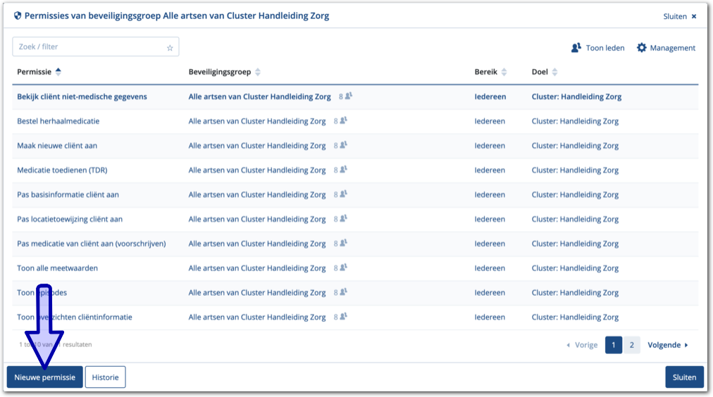 | Voor een arts geldt dat deze de arts van inschrijving moet zijn van de cliënt. Anders gezegd, alle cliënten waaraan de arts is gekoppeld zijn 'eigen cliënten' van de arts. in de praktijk komt het weinig voor dat een arts een permissie krijgt voor alleen zijn 'eigen cliënten'. Een arts moet in de dienstsituatie medicatie kunnen raadplegen en indien nodig aanpassen. Vaak hebben de permissies van artsen daarom het bereik 'Iedereen'.