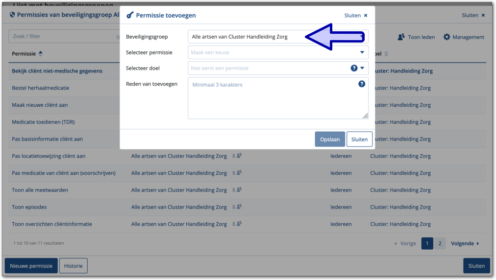 Hier geeft u aan waarover de permissie geldt. Dit kan bijvoorbeeld 'Afdeling 1e verdieping' of 'Formularium Handleiding' zijn. Het type permissie bepaalt wat de beschikbare doelen zijn. Klik in het veld om