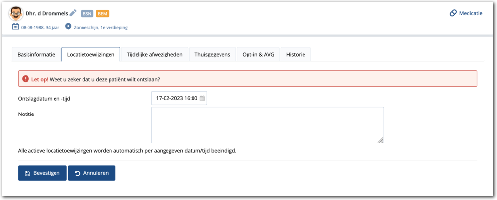 De ontslagdatum en -tijd is vooraf ingevuld met de datum en tijd van nu. Optioneel kunt u deze aanpassen en/of een notitie toevoegen.