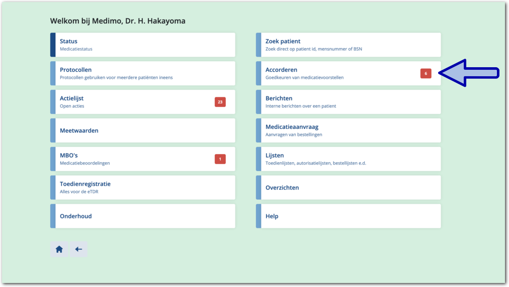 Medimo toont dit in het dashboard bij de knop 'Accorderen' zie blauwe pijl in onderstaand voorbeeld.