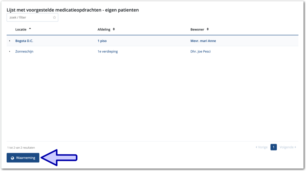 Standaard toont Medimo de opdrachten van uw eigen cliënten. Zijn er geen opdrachten voor uw eigen cliënten dan toont Medimo de opdrachten voor collega artsen. Deze opdrachten zijn ook met de knop 'Waarneming' (zie blauwe pijl in de bovenstaande afbeelding) na te gaan.