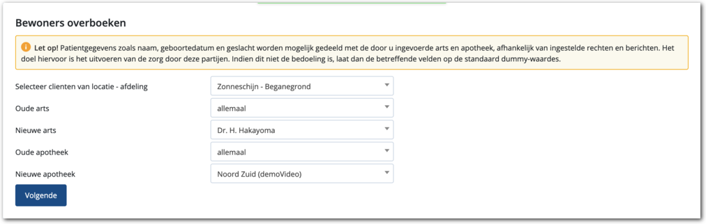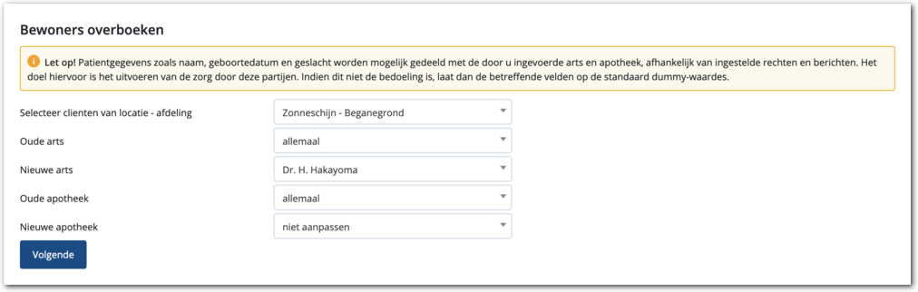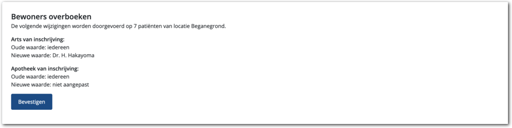 In bovenstaand voorbeeld worden van alle cliënten van afdeling 'Beganegrond' de arts aangepast naar 'Dr. H. Hakayoma' en wordt de apotheek niet aangepast.