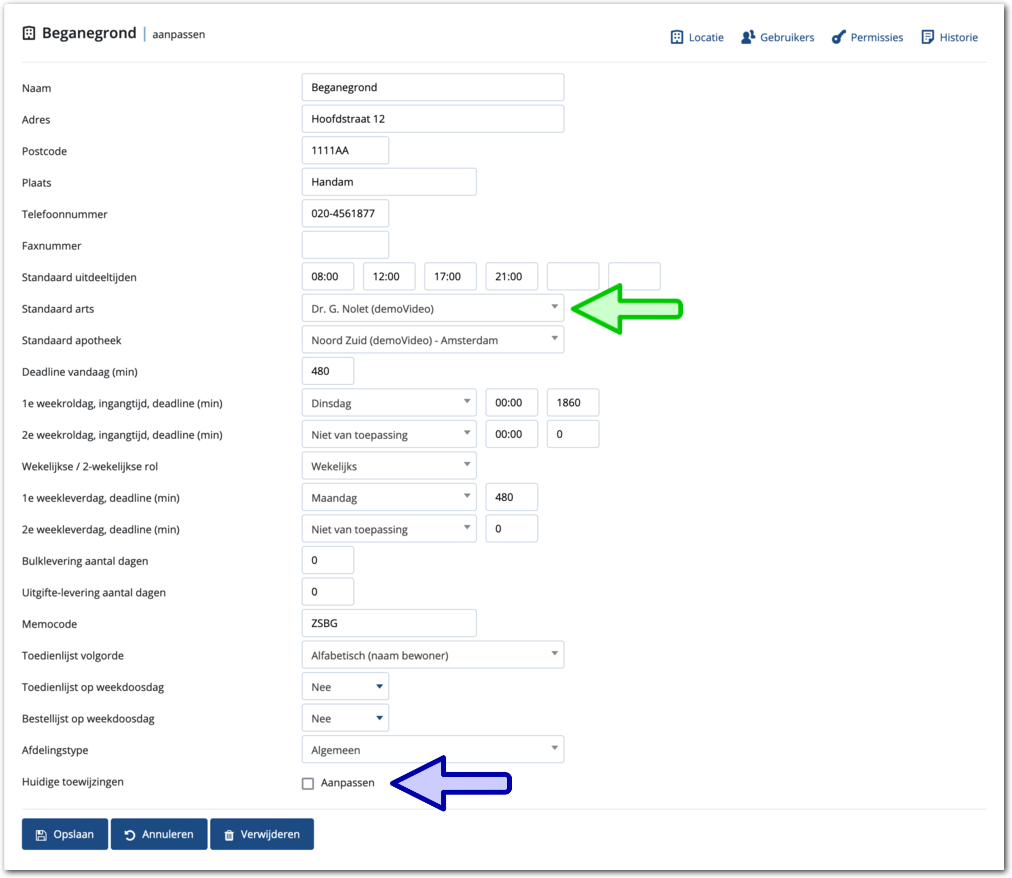 Dit doet u bij de afdeling entiteit. Daar dient u de standaard arts (groene pijl in onderstaande afbeelding) aan te passen en de optie 'Aanpassen' (blauwe pijl in onderstaande afbeelding) aan te vinken bij huidige toewijzingen. Volg de onderstaande instructies om de arts van een afdeling te wijzigen en door te voeren bij de cliënten.