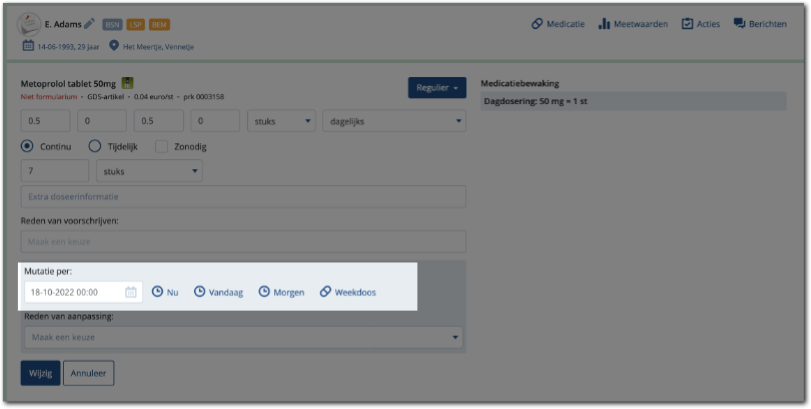 Nadat u de dosering hebt opgegeven dient u het mutatie per moment te controleren.