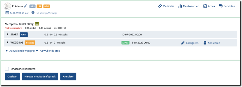 Hierbij toont Medimo de huidige dosering (te herkennen aan het blauwe label 'Actief') en de wijziging (te herkennen aan het gele label 'Concept'). Hier controleert u het voorschrift en kunt snel en eenvoudig wijzigen doorvoeren of een nieuwe medicatie afspraak maken.
