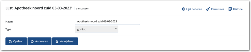 Dit kan via 'lijsten beheren'. Gebruik het 'Zoeken in alles'-veld of klik vanuit het hoofdmenu op Onderhoud > Geneesmiddellijsten > Lijsten beheren. Daar toont Medimo een lijst van geneesmiddellijsten. Klik op de betreffende lijst om de details te openen. De onderstaande afbeelding is een voorbeeld van de details van een geneesmiddellijst.