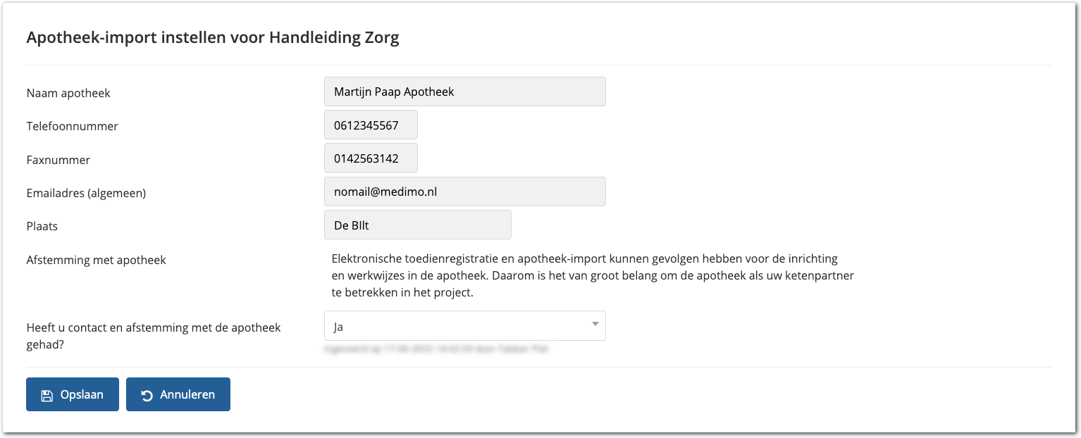 Elektronische toedienregistratie en apotheek-import kunnen gevolgen hebben voor de inrichting en werkwijzes in de apotheek. Daarom is het van groot belang om de apotheek als uw ketenpartner te betrekken in het project. Om die reden wordt gevraagd de afstemming met de apotheek te bevestigen. De afbeelding hieronder toont daarvan een voorbeeld. Heeft u de apotheek nog niet betrokken? Neem dan eerst contact op met de apotheek voordat u de importconfiguratie afrondt. Is de apotheek op de hoogte, dan kunt verder met de knop Opslaan.