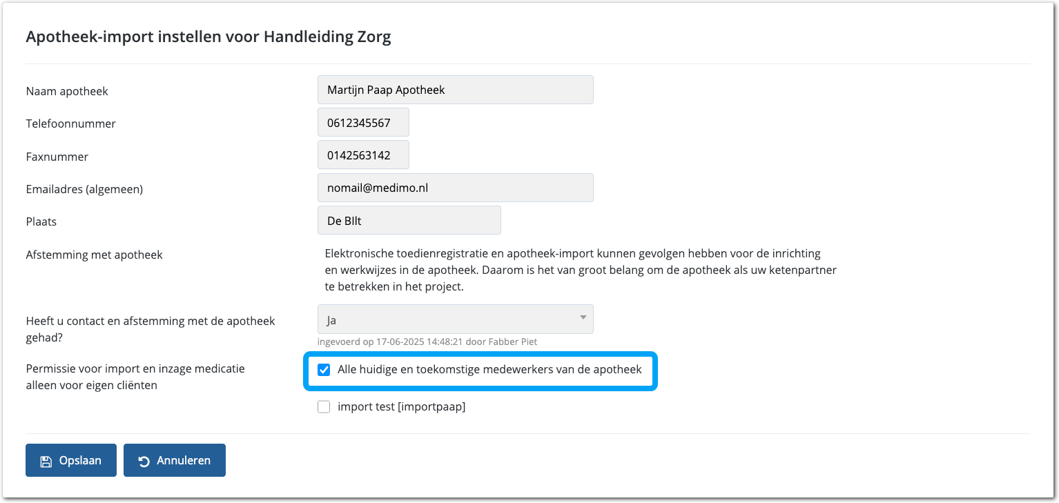 Nadat u het contact met de apotheek hebt bevestigd, kunt u op eenvoudig wijze de juiste permissies toekennen. Deze permissies zijn noodzakelijk om medicatie te kunnen importeren. U kent de permissies toe door de optie Alle huidige en toekomstige medewerkers van de apotheek aan te vinken. De afbeelding hieronder toont daarvan een voorbeeld.