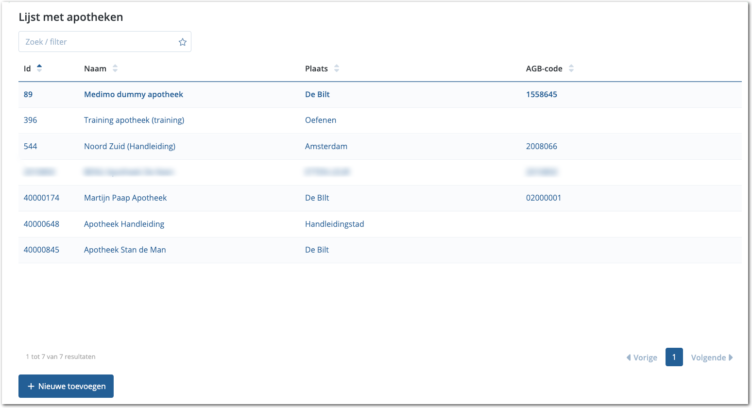 Kies voor Landelijke apotheek toevoegen. Vervolgens wordt de tabel met landelijke apotheken weergegeven. Hier kunt u zoeken naar de betreffende apotheek. Dit kan op naam, plaats en AGB-code. Klik vervolgens op de juiste apotheek om die toe te voegen. Hierna keert u terug naar de tabel met apotheken uit uw zakelijk verband.