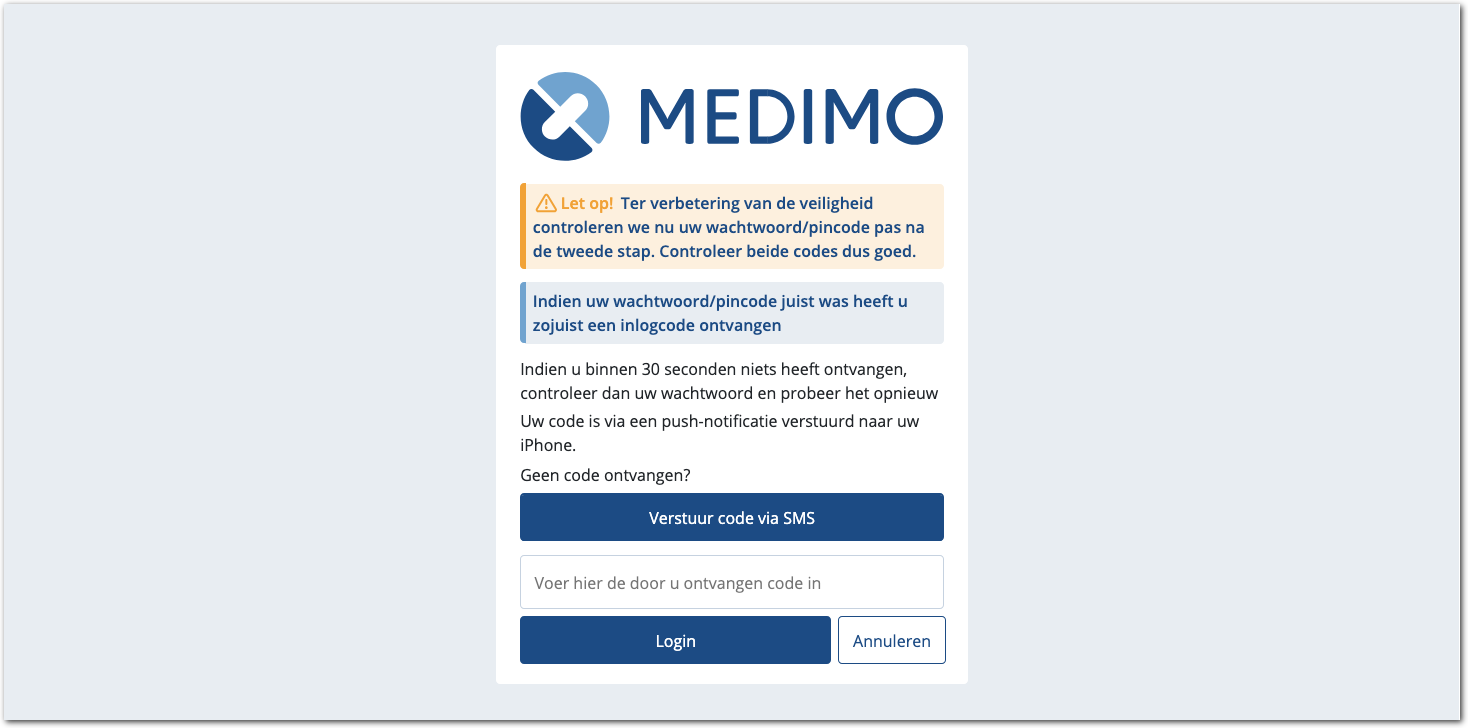 U kunt inloggen met een code die u ontvangt per sms. Deze code kan ook naar de MedimoApp worden gestuurd. Hierdoor kunt u primair inloggen met de MedimoApp en de sms-methode als back-up gebruiken.