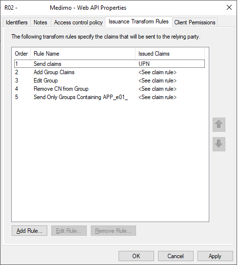 c:[Type == "http://test.com/phase2"] => add(Type = "http://schemas.xmlsoap .org/claims/Group", Value = RegExReplace(c.Value, "^CN=", "")); - Send Only Groups Containing APP_e01_ (of andere gewenste selectie):