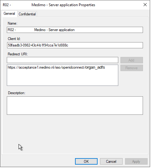 - GGZ acceptance - https://acceptance-ggz.medimo.nl/sso/openidconnect/{klantnaam}_adfs