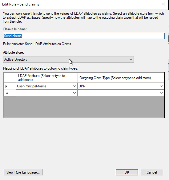 c:[Type == "http://schemas.microsoft.com/ws/2008/06/identity/claims/ windowsaccountname",Issuer=="ADAUTHORITY"]=>add(store="ActiveDirectory",