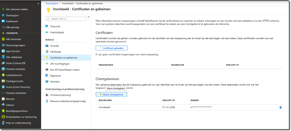 Let op! Alleen tijdens het aanmaken kan het wachtwoord worden getoond. Check dus goed of deze geen '/' of '+' bevatten!Nadat het het wachtwoord hebt bevestigd is het clientgeheim aangemaakt en wordt getoond bij de sectie 'Cliëntgeheimen.