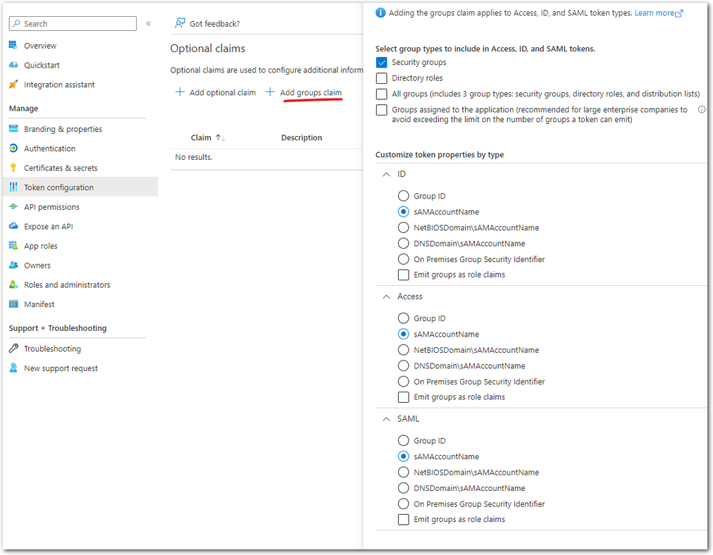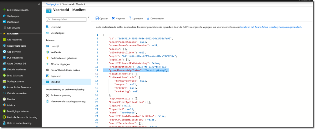 - Wijzig de optie "groupMembershipClaims": "SecurityGroup"