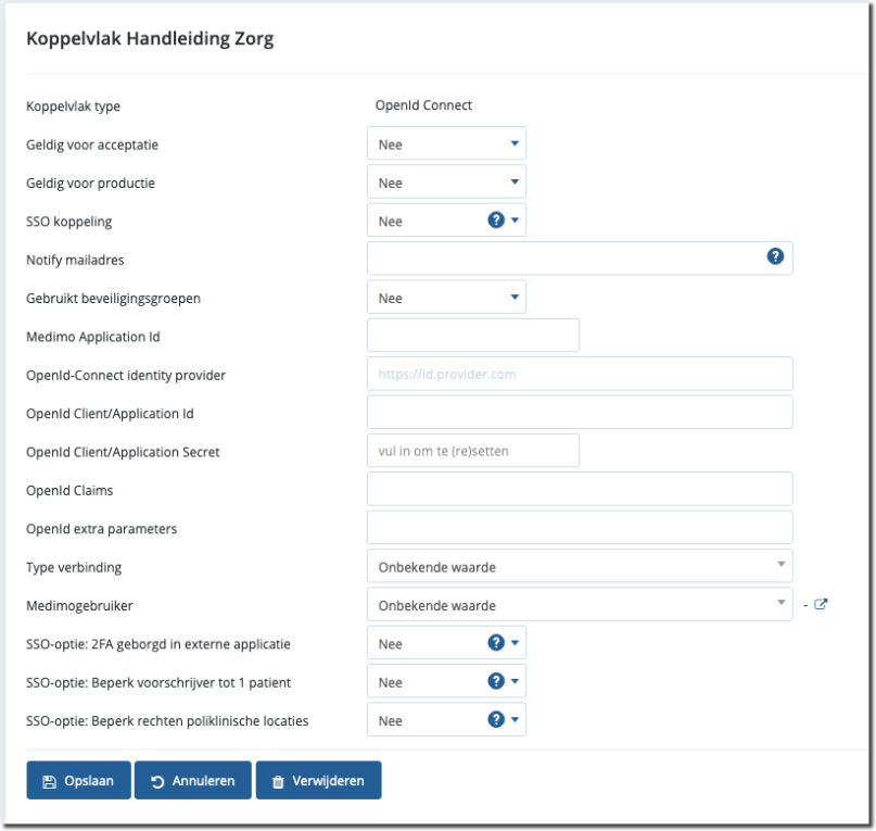 OpenId-Connect identity provider | Geef hier de aangeleverde Identity provider op. Deze levert de klant aan. |