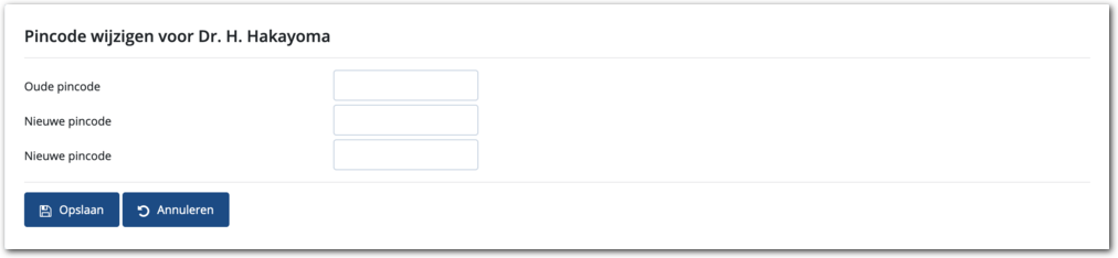 Ja, mits u een account op naam in Medimo hebt. Is dit het geval dat kunt u dit aanpassen bij 'Pincode wijzigen'. Gebruik het 'Zoeken in alles'-veld of klik vanuit het hoofdmenu op Onderhoud > Gebruiker > Pincode wijzigen. Daar toont Medimo een scherm waar u de pincode kunt wijzigen. De onderstaande afbeelding is daarvan een voorbeeld.