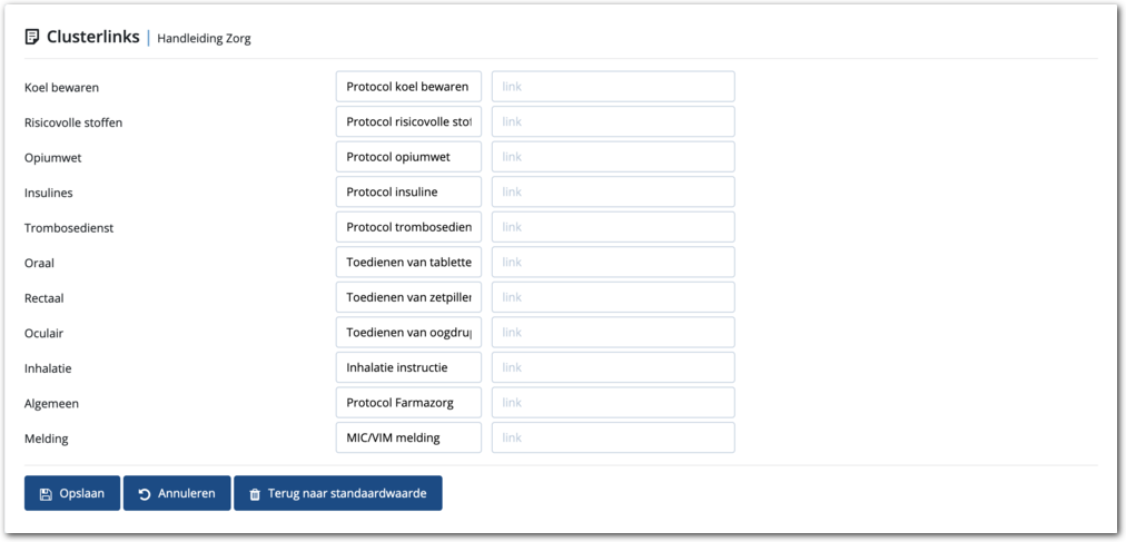 - Algemeen - Algemene hyperlink, wordt altijd getoond. Kan bijvoorbeeld gebruikt worden om te verwijzen naar het Farmazorg Protocol.