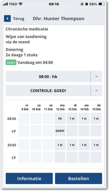 Hiermee legt u het aantal vast, zet u de toediening in de wacht en toont Medimo het overzicht van het middel. Dit komt overeen met de onderstaande afbeelding.