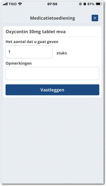 Hierna vraagt de app het aantal dat u gaat toedienen, op te geven. Hierbij is het aantal vooringevuld conform het voorschrift. De onderstaande afbeelding is daarvan een voorbeeld.