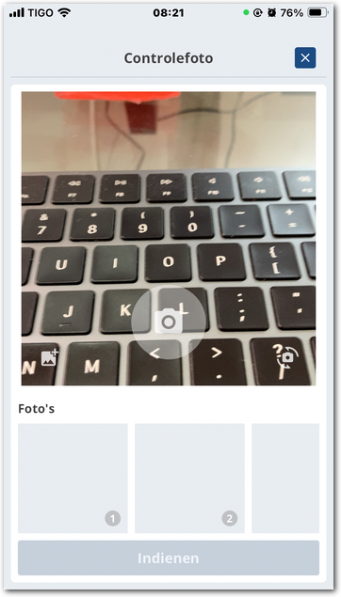 U kunt maximaal 10 foto's maken. Alle gemaakte foto's worden onderin getoond. De bovenstaande linker afbeelding is hiervan een voorbeeld. Ook kunt u gebruik maken van extra opties om de controlefoto(s) conform de werkafspraken aan te bieden.