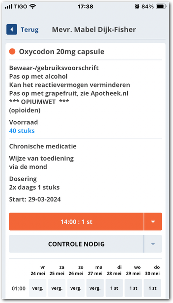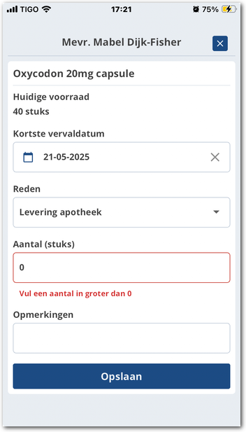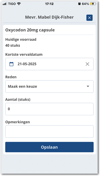 In Medimo kan de voorraad van een middel worden vastgelegd. Hierdoor kunt u onder andere werken met opiatenregistratie en automatisch bestellen. In de MedimoApp wordt de huidige voorraad getoond en kunt u deze corrigeren, mits u daarvoor de