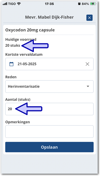 Naast het aantal kunt u ook de kortste vervaldatum nagaan, vastleggen en corrigeren. Dit kunt u tegelijkertijd doen met het corrigeren van het aantal. Het is ook mogelijk om enkel de vervaldatum te corrigeren. Op dit moment wordt echter in de app afgedwongen een reden op te geven en een aantal dat groter is dan 0. Wilt u alleen de kortste vervaldatum corrigeren, dan wordt aangeraden als reden 'Herinventarisatie' te kiezen en het aantal dat gelijk is aan de huidige voorraad op te geven. De onderstaande afbeelding is hiervan een voorbeeld. De blauwe pijlen wijzen naar de waarden die gelijk moeten zijn.