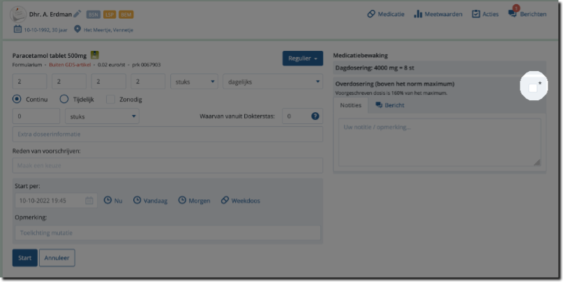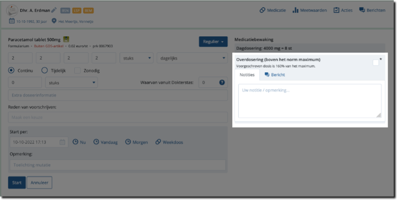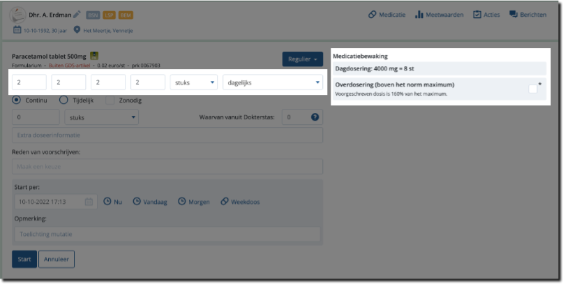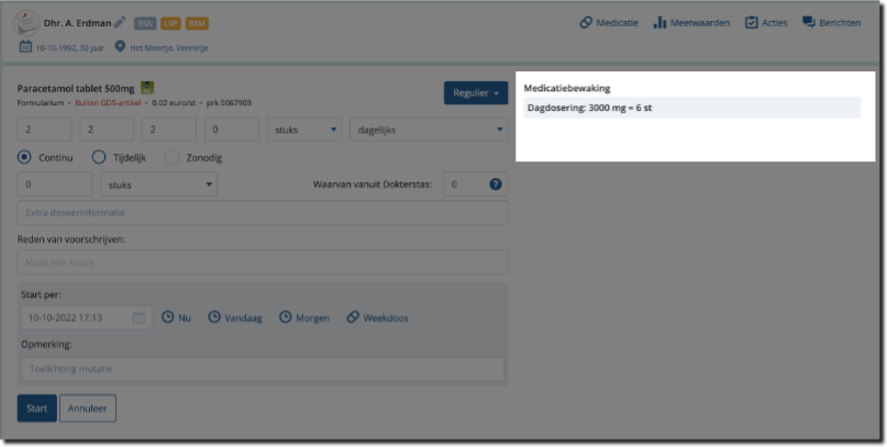Tijdens het opgeven van de dosering toont Medimo rechts de medicatiebewaking.