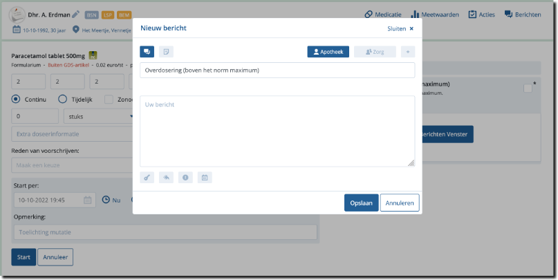 Medimo toont het maken van een nieuw bericht in een pop-up. Hierbij is het het medicatiebewaking signaal in het onderwerp gezet.